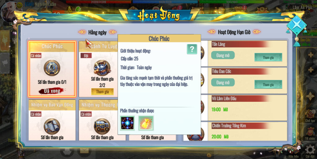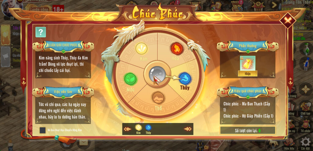📍Mẹo nhỏ : > Đừng chỉ quay lấy buff tạm thời! Mục tiêu quan trọng nhất của tính năng này là tích lũy Danh vọng Chúc Phúc. Đại Hiệp nên đầu tư Lệnh Bài để quay Chúc Phúc đều đặn mỗi ngày và tích lũy danh vọng, về sau sẽ dùng để đổi Phù Chúc Phúc ( món bảo vật mang lại sức mạnh cực lớn cho nhân vật).