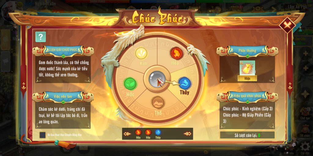 - Nếu quay TRÙNG: Kết quả lần sau giống lần trước sẽ giúp gia tăng hiệu quả chúc phúc và Đại Hiệp được tiếp tục quay thêm lượt đến khi ra khác nguyên tố để kết thúc chúc phúc.