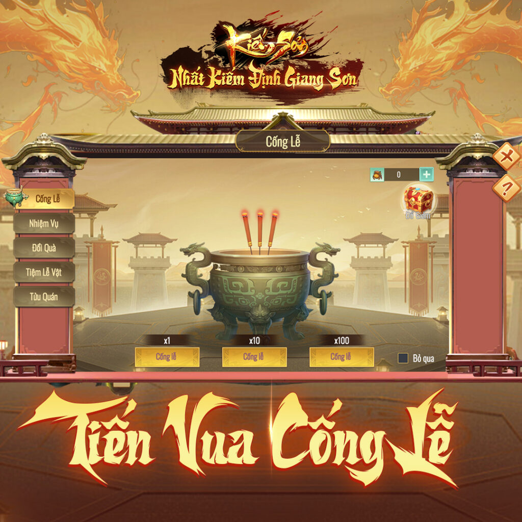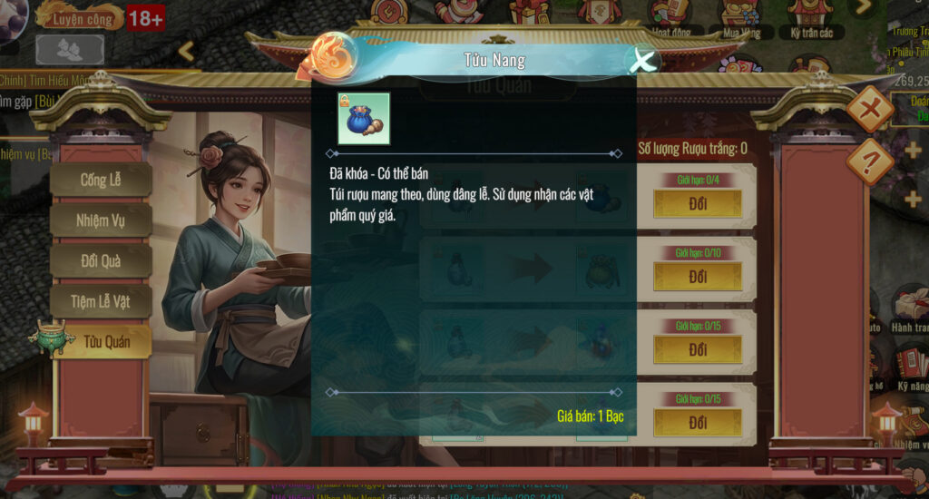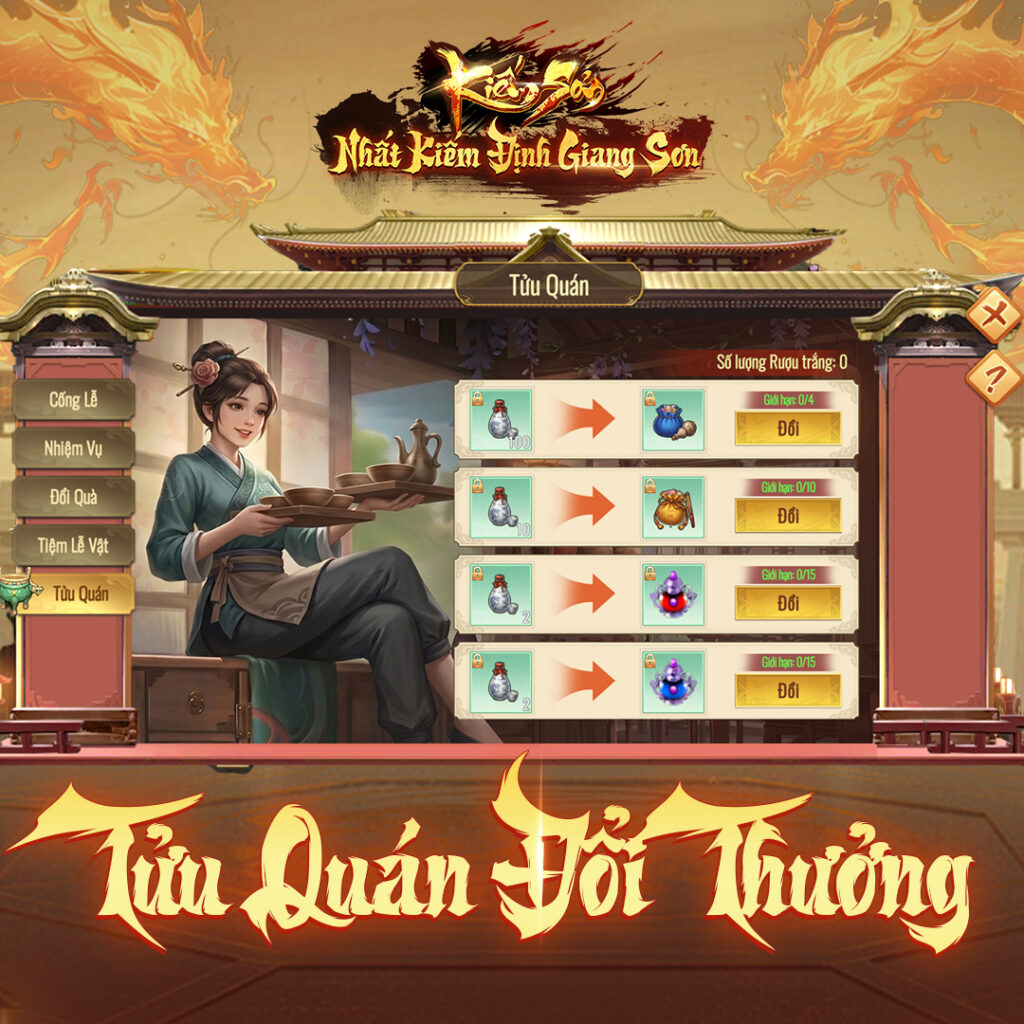 - Cống Lễ & Đổi thưởng: Sử dụng Hương Lễ Nang để Cống Lễ nhận Rượu trắng và quà ngẫu nhiên. Cuối cùng, dùng Rượu trắng để đổi các vật phẩm giá trị tại Tửu Quán.